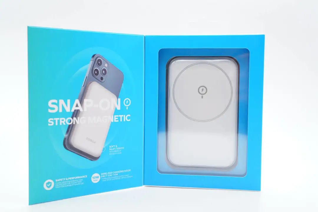 包裝盒書本式設計,封面另一面印有產品使用場景圖,透過櫥窗可見充電寶實體,展示效果好。