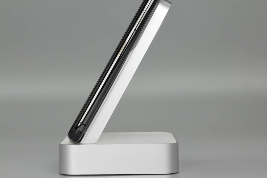 支撐板正面有兩個旋渦圖案,表示無線充區(qū)域,手機(jī)橫豎都能進(jìn)行無線充電。