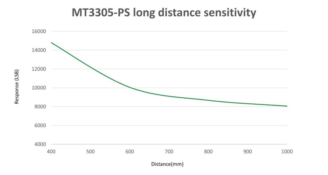 增益范圍越寬,靈敏度越高。MT3305可以實(shí)現(xiàn)0.5x~4096x的超寬增益范圍,不僅可以大大增強(qiáng)設(shè)備在暗光下的檢測能力,對強(qiáng)光環(huán)境同樣具備很好的適應(yīng)性。其環(huán)境光檢測靈敏度可達(dá)到<0.0005 Lux/LSB,接近檢測的距離可達(dá)到40cm以上。