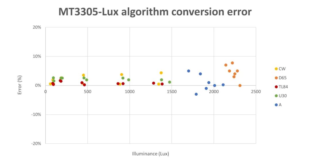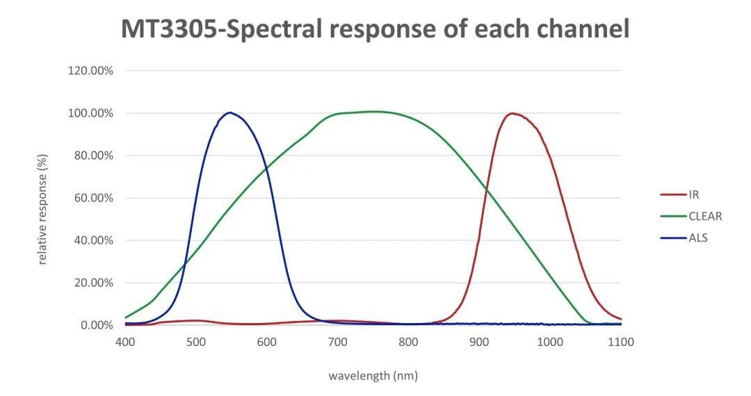 MT3305晶圓采用專用光學(xué)鍍膜技術(shù),可以有效提高光學(xué)特性,通過在感應(yīng)區(qū)上采用不同的鍍膜來實(shí)現(xiàn)ALS、IR、CLEAR的光譜響應(yīng)。ALS通道符合人眼響應(yīng)光譜曲線,IR通道以940nm為中心頻點(diǎn)只對高紅外部分光線響應(yīng),CLEAR通道對全光譜進(jìn)行響應(yīng),結(jié)合美芯晟自研的Lux轉(zhuǎn)換算法,能夠?qū)⒉煌庠聪碌恼斩戎嫡`差有效地控制在10%以內(nèi),使得MT3305的照度識別更加準(zhǔn)確。