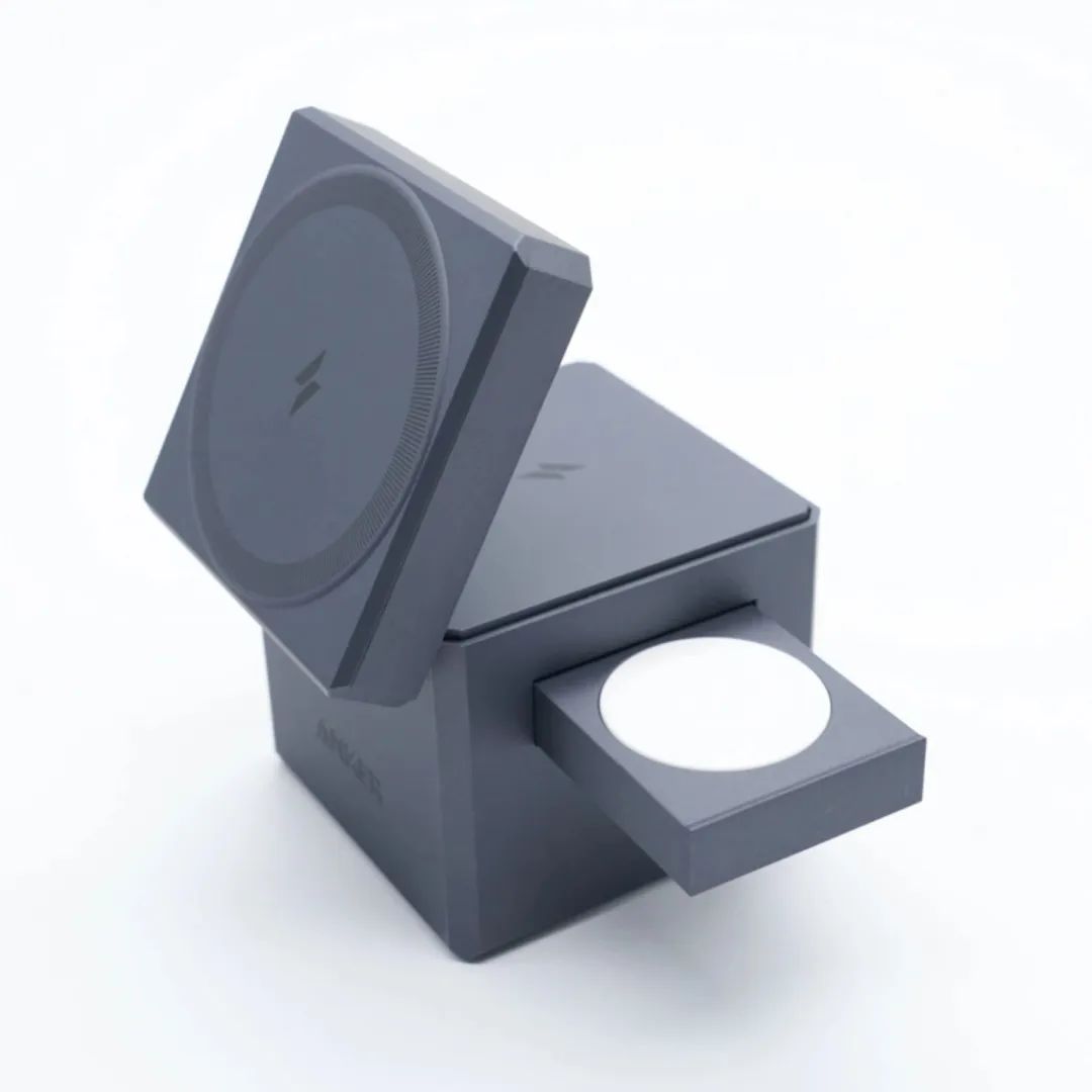總體來看,安克這款三合一無線充電器采用方塊設(shè)計,深灰色配色十分精致。設(shè)計上創(chuàng)新使用變形“魔方”,可伸可縮可折疊,滿足手機(jī),手表和耳機(jī)同時無線充電。